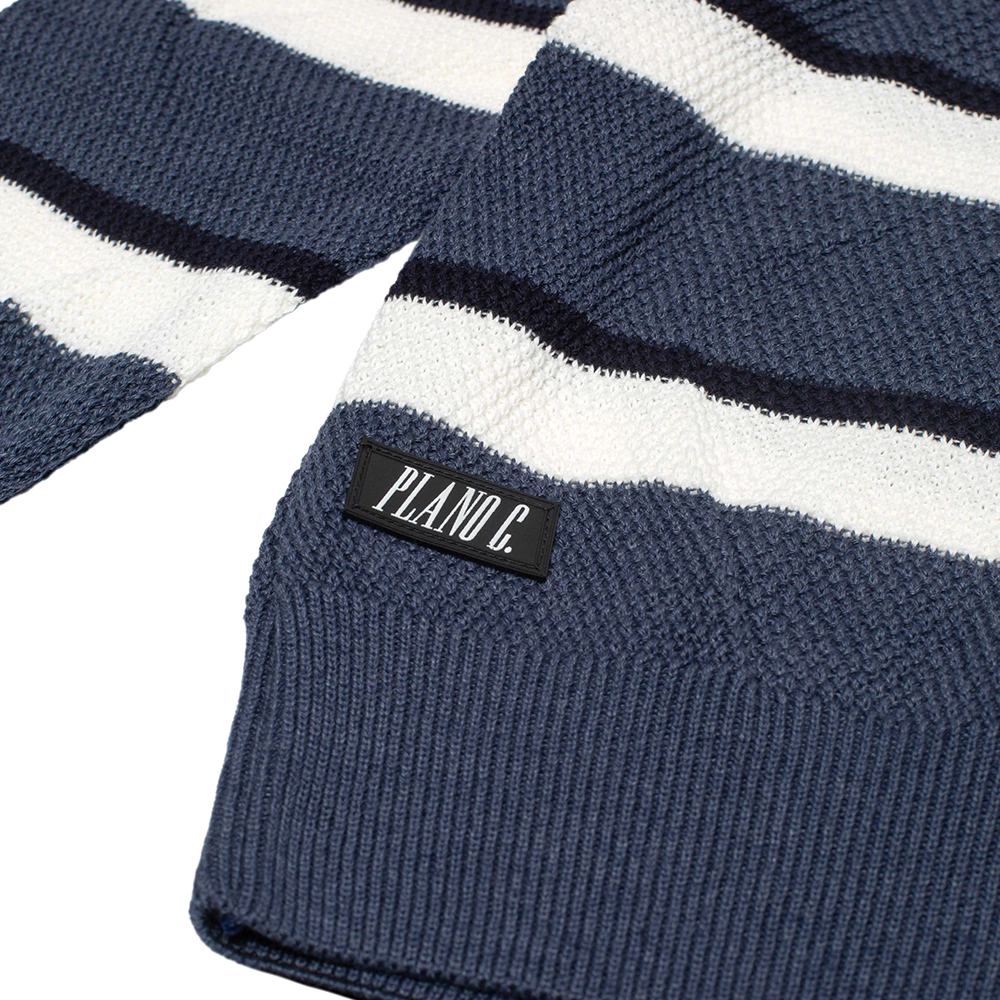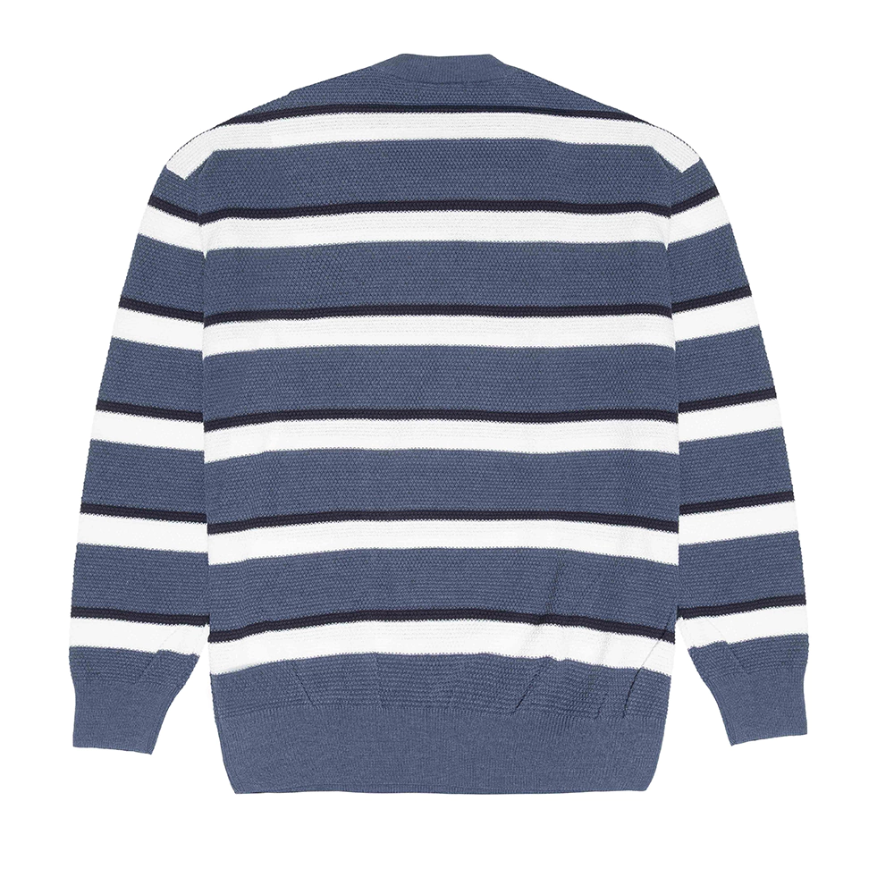 Suéter com modelagem reta, gola careca e acabamento canelado na barra e nos punhos. A peça se destaca pela padronagem listrada em núcleos contrastantes, com etiqueta emborrachada personalizada aplicada na barra.